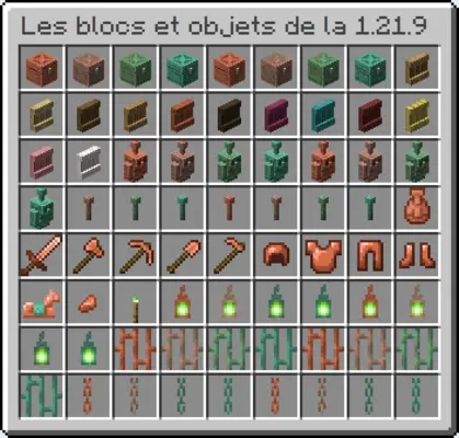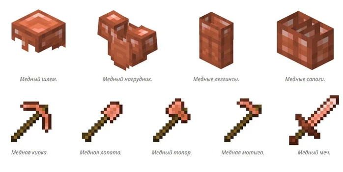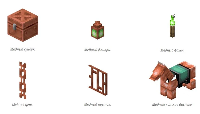Медь, ранее ограничивавшаяся несколькими декоративными блоками, становится одним из основных материалов . Теперь вы найдёте медные сундуки , медные факелы , медные фонари , медные цепи и медные слитки. Все эти блоки со временем окисляются, но их можно натирать воском для сохранения блеска.