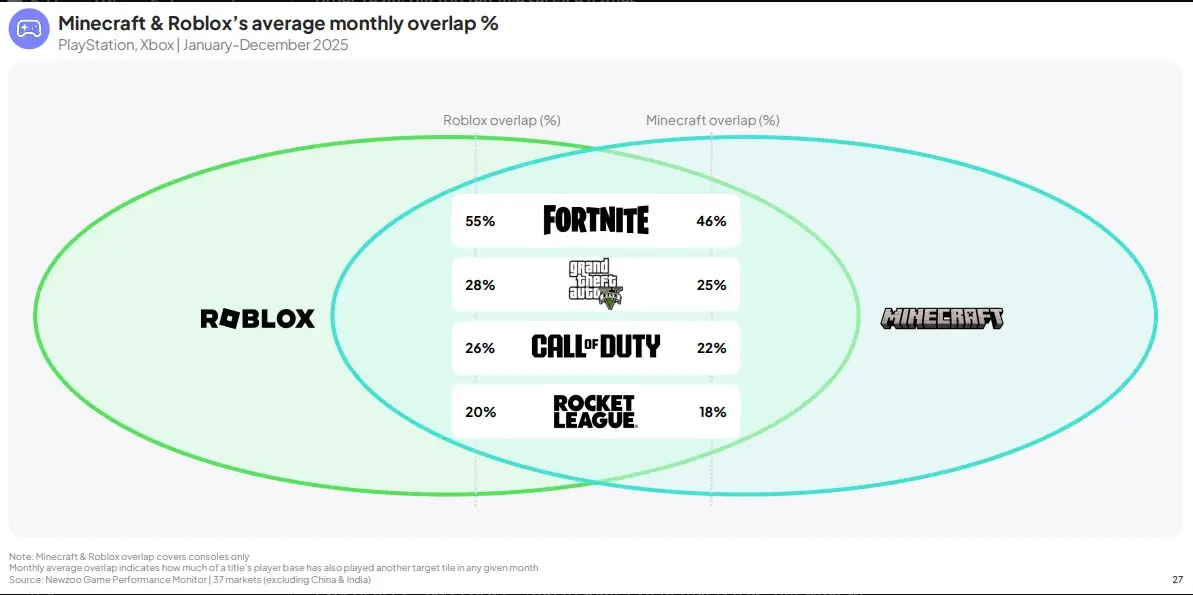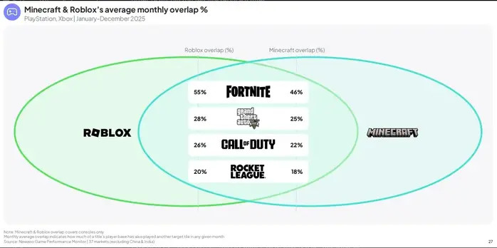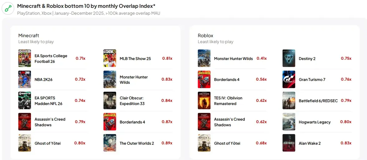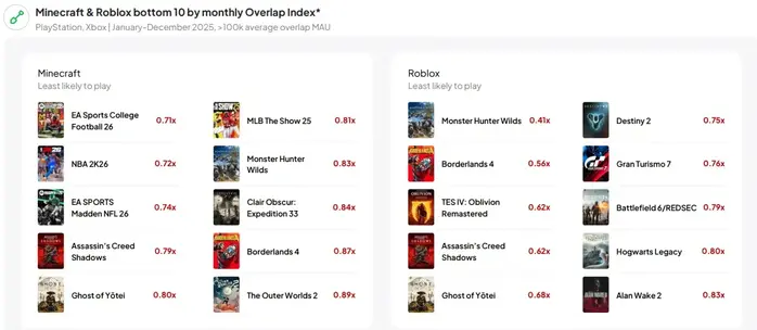 По словам Бена Портера, директора-консультанта Newzoo, вероятность запуска Monster Hunter Wilds у пользователей Roblox всего в 0,4 раза выше, чем у среднестатистического пользователя. На PlayStation и Xbox наименее популярными играми серии Minecraft являются Clair Obscur: Expedition 33, Assassin's Creed Shadows, Borderlands 4 и Ghost of Yōtei.