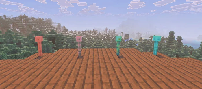 Существует ряд декоративных медных блоков : фонари , факелы , цепи и прутья . Их постепенное окисление со временем меняет цвет ваших зданий, если только вы не нанесёте воск, чтобы закрепить штукатурку. Громоотвод теперь работает по тому же принципу: он тоже окисляется , идеально подходя для крыш, которые прослужат долгие годы.
