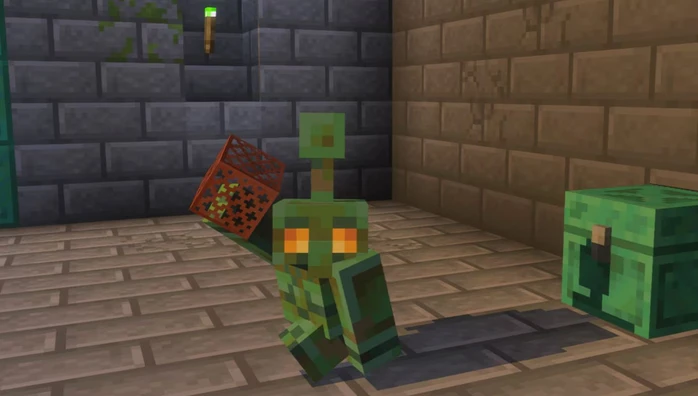 Медный голем — существо, созданное игроком : поместите резную тыкву на медный блок, чтобы призвать его. Появившись, он предоставит медный сундук и приступит к работе: бросьте в него предмет, и он рассортирует ваши вещи, находя одинаковые предметы в соседних сундуках. Это удобно для переполненных баз и ещё более полезно для мастерских, работающих круглосуточно.