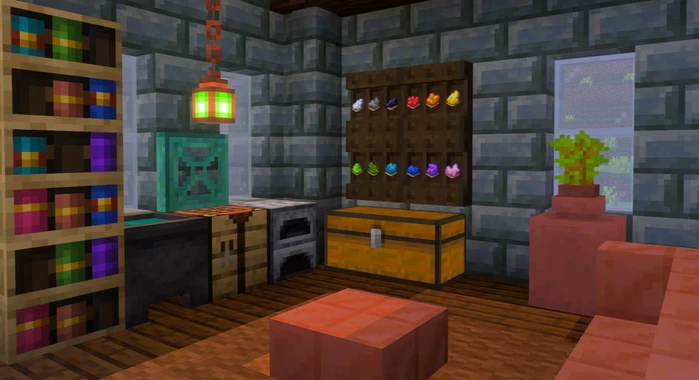 Новая полка отображает до трёх предметов и позволяет менять их местами одним щелчком правой руки. А ещё лучше — выстроить несколько полок в ряд, чтобы создать длинную линию для визуального отображения или хранения . Под воздействием редстоуна полка позволяет менять местами несколько предметов одновременно — удобно, если декор выходит из строя или драка начинается в ту секунду, когда вы держите картину вместо жемчужины Края . Это и эстетично, и функционально .
