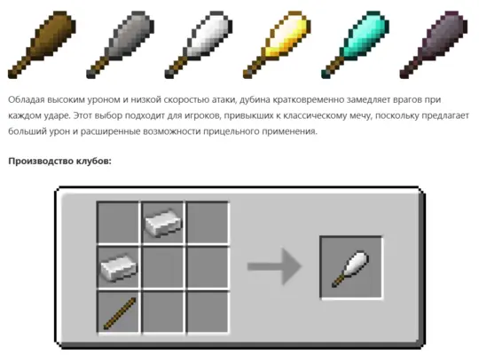 Мод Basic Weapons улучшает боевую систему в Minecraft , добавляя пять типов оружия для каждого материала: дерева , камня , железа , золота , алмаза и незерита . Это новое оружие призвано дополнить существующие мечи и топоры (а вскоре и булавы ), предлагая больше тактического разнообразия в бою. Каждое оружие тщательно сбалансировано с точки зрения урона, скорости атаки, стоимости крафта и специальных эффектов, чтобы обеспечить бесшовную интеграцию в игру.