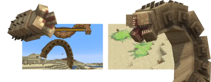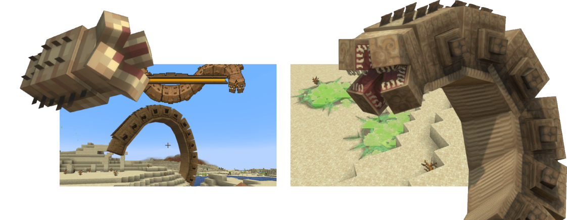 Это существо, скрывающееся под песками пустыни, внезапно выскакивает из воды, чтобы атаковать. Оно поглощает блоки и существа, а затем ныряет обратно под землю и неожиданно появляется вновь. Его непредсказуемая натура делает его одним из самых опасных боссов в моде.