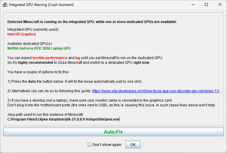 - Система обнаружения графического процессора , которая предупреждает, если игра использует интегрированную видеокарту вместо дискретной, и предлагает автоматически исправить это.