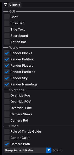 Наконец, Flashback включает в себя визуальную панель управления , позволяющую показывать или скрывать элементы интерфейса и мира: игроков, сущности, частицы, туман, HUD и т. д. Таким образом, вы можете получить изысканное изображение, идеально подходящее для кинематографического рендеринга.
