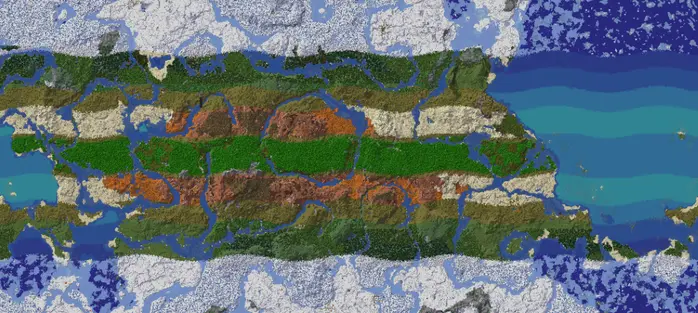 Принцип прост, но эффективен: мир разделён на широтные пояса, немного напоминающие планисферу. В результате возникают ледяные полюса, умеренные пояса, тропики и даже экватор, отмеченный джунглями. Такая организация сразу же придаёт ландшафтам более естественный и, главное, более читабельный вид.