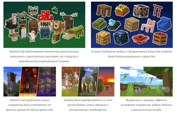 Помимо осязаемого контента, RealismCraft выделяется своими эффектами . Порхающие бабочки, кружащаяся на ветру пыль, падающие звёзды и радуги дополняют ваши приключения. Даже погода становится более напряжённой: появляются песчаные бури, метели и впечатляющие грозы.