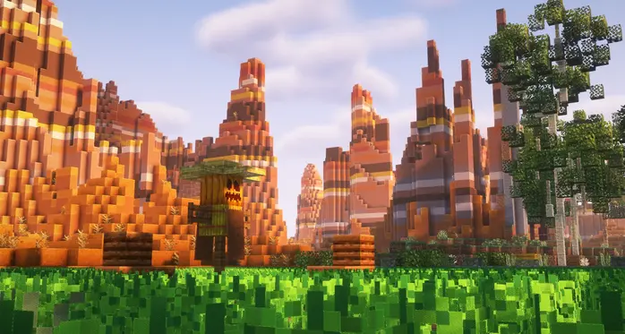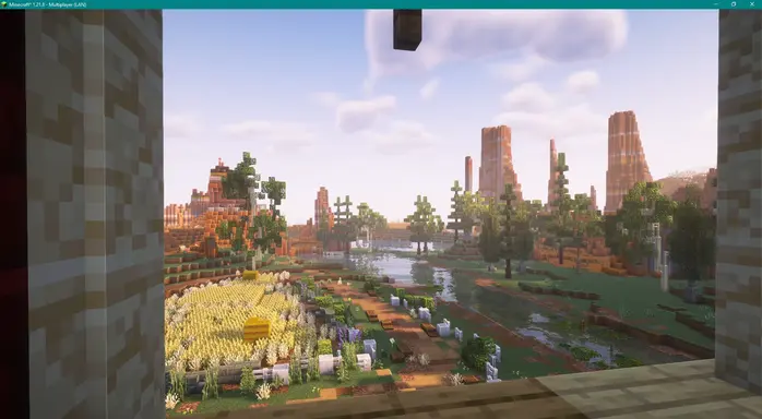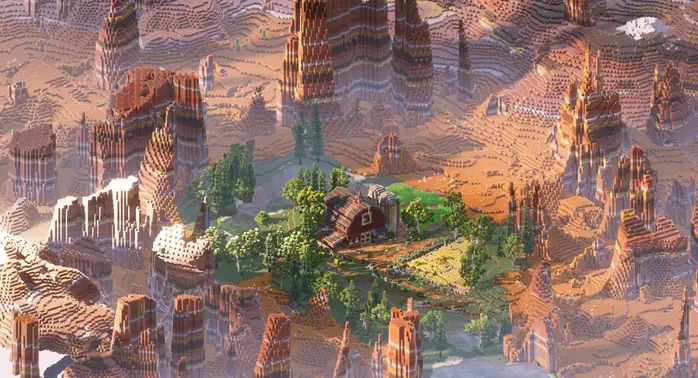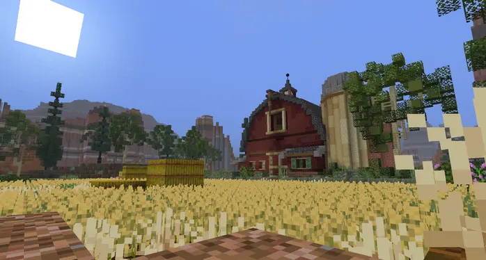 Выбор биома не случаен. Ферма контрастирует с теплыми, засушливыми цветами бесплодных земель, создавая интересный визуальный эффект. Возделанные поля добавляют немного зелени на фоне оранжевого ландшафта, а большой амбар становится естественной достопримечательностью.