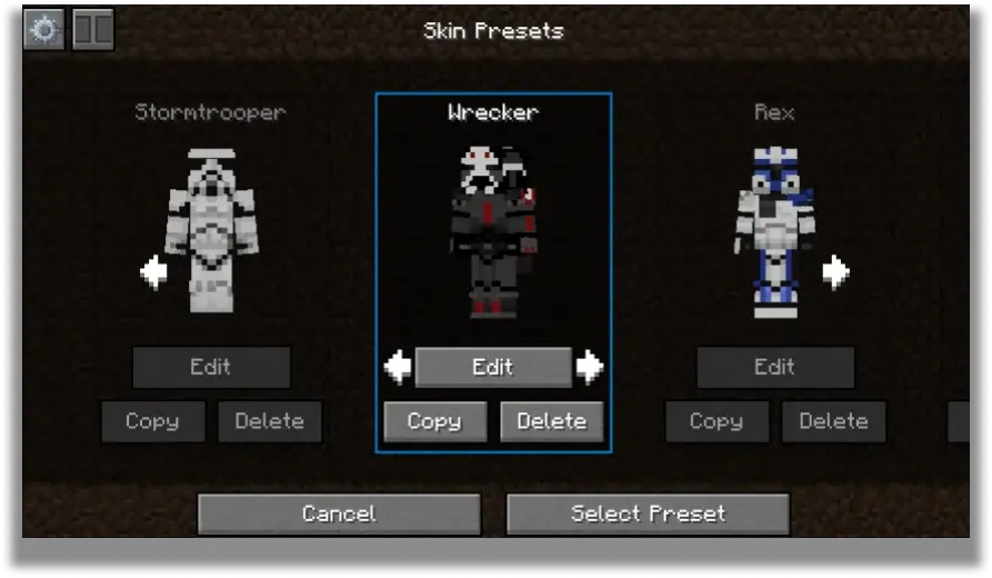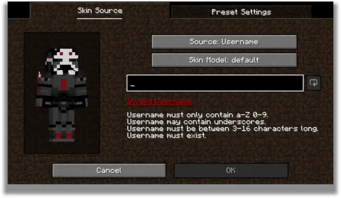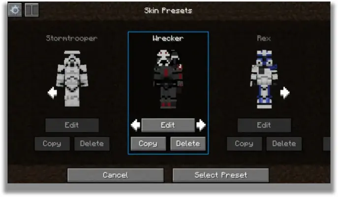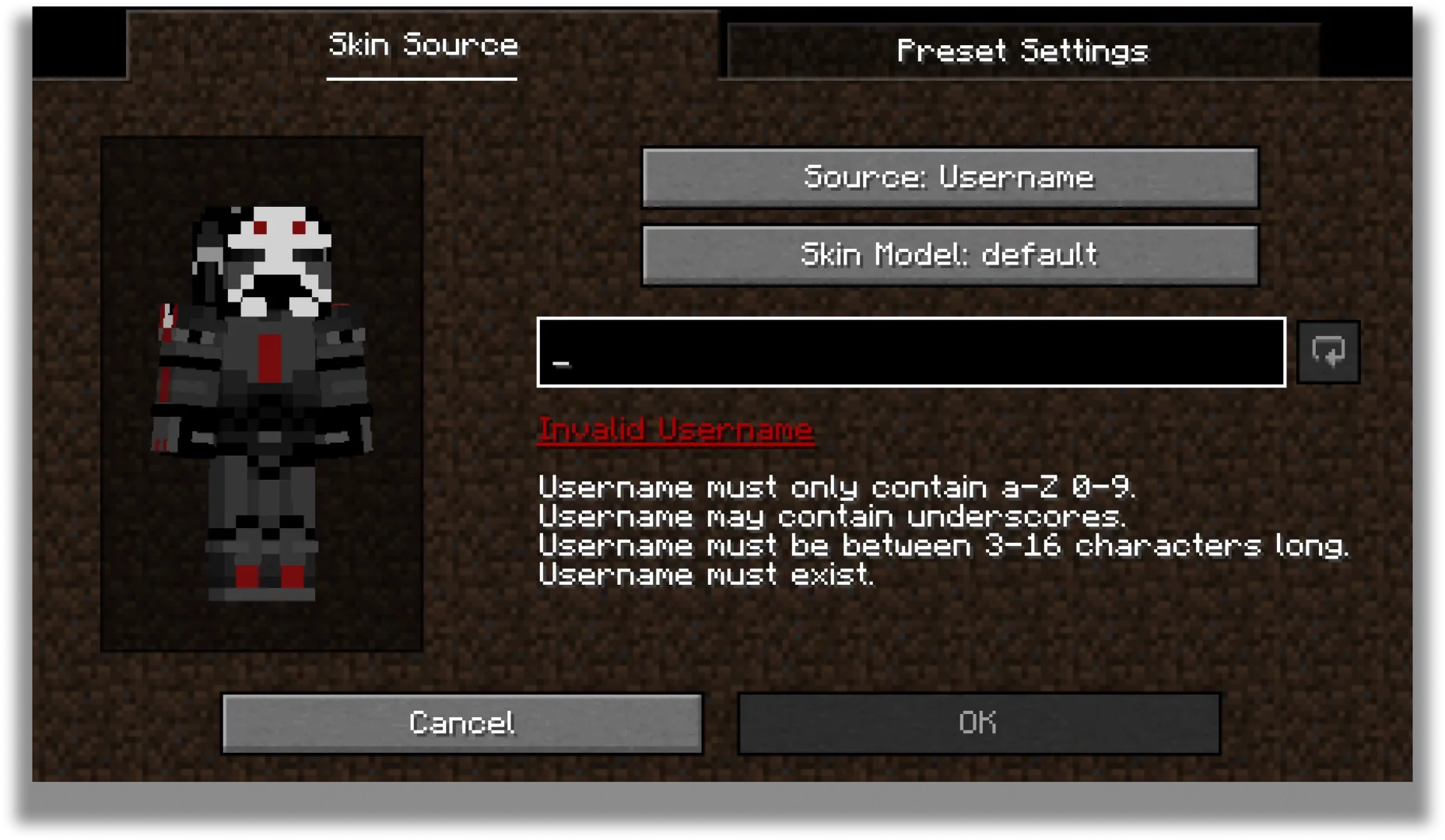 На экране редактирования вы получаете доступ к основным настройкам: текстура, тип модели ( Стив или Алекс) и название предустановки. В планах обновления для интеграции управления плащом и любых дополнительных косметических элементов.