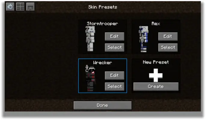 SkinShuffle основан на системе предустановленных скинов . Каждый предустановленный скин соответствует сохраненному скину, который можно вызвать в любое время. Эти предустановленные скины могут быть созданы из нескольких источников:
