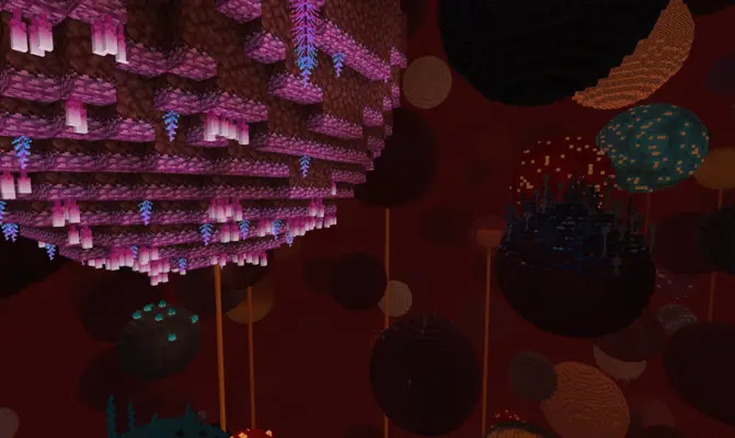 Мод Starry Skies добавляет в Minecraft уникальное измерение: теперь ландшафт состоит не из континентов или островов, а из сфер, парящих в пустоте. Каждая из них может содержать полезные ресурсы, постройки или опасные зоны. Некоторые из них богаты минералами, в других находятся подземелья, и нередко встречаются лавовые карманы.
