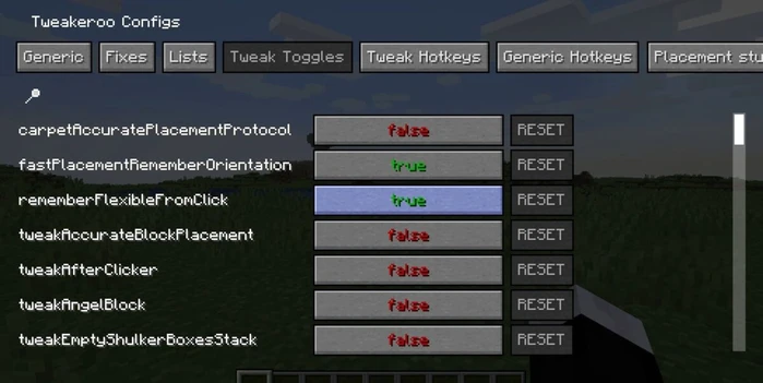 В основе Tweakeroo лежит длинный список настроек, называемых «твиками», каждый из которых соответствует определенной функции. Эти параметры позволяют, например, автоматизировать определенные повторяющиеся действия или исправить поведение, которое считается неудобным в стандартной версии клиента.
