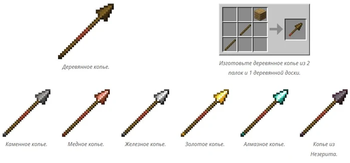Копье — оружие ближнего боя, доступное из различных материалов: от дерева до незерита . Оно позволяет использовать его двумя различными способами:
