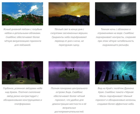 Пакет работает только с текстурами неба , что делает его лёгким и удобным для ежедневного использования. Скриншоты приобретают глубину, покадровые съёмки выигрывают за счёт более выразительного фона, а карты приключений остаются читабельными. Для установки он добавляется как классический пакет ресурсов и активируется из меню. Если установлены шейдеры, может быть полезно проверить их настройки, связанные с небом, если изменения не проявляются сразу.