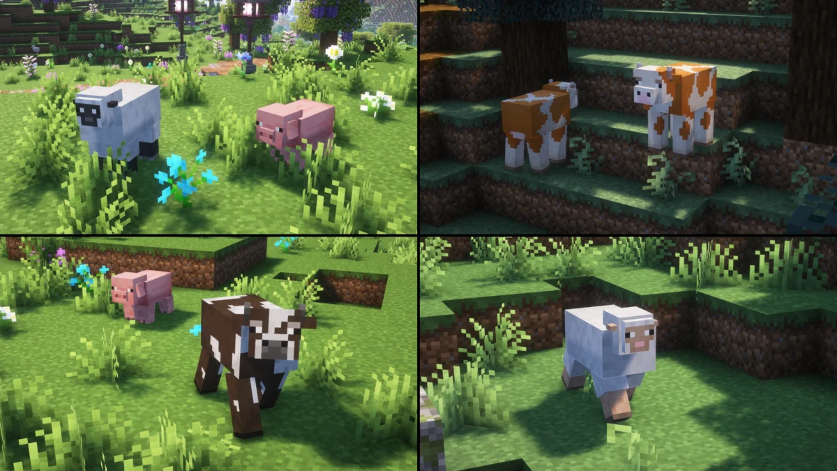 В улучшенной версии также представлены различные варианты мобов. Базовые модели (коровы, овцы, свиньи) переработаны, и к ним добавлены альтернативные текстуры, которые вносят некоторое разнообразие, не отклоняясь от оригинального дизайна.